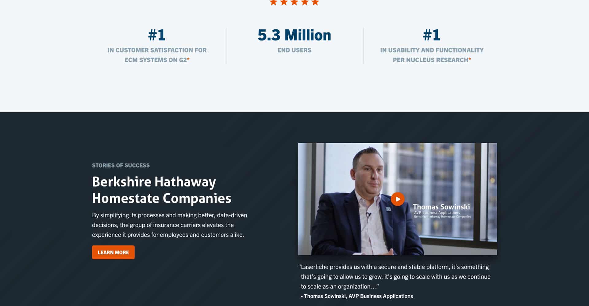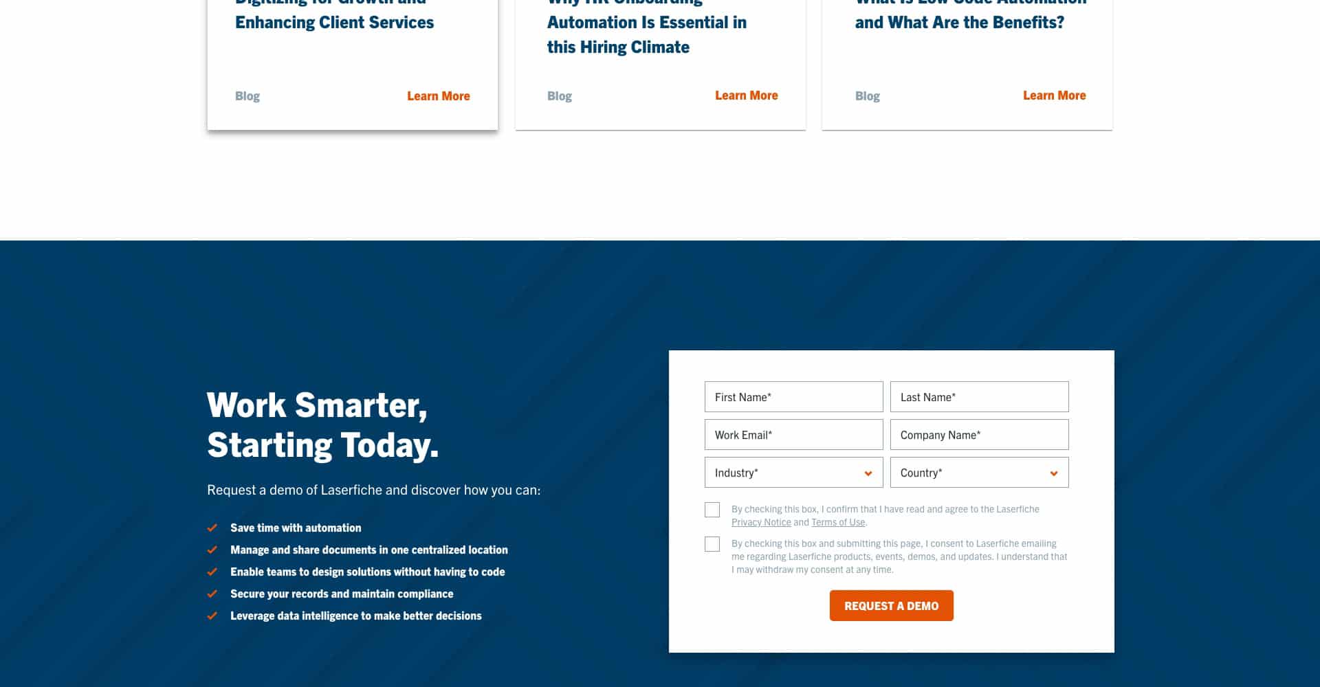 The transformative website redesign saw positive results shortly after launch. Organic search surged by 19.93%, driving increased visibility and attracting relevant traffic. Sessions increased by 11.04%, showcasing higher engagement. New Users grew by 7.38%, expanding the audience. A reduced bounce rate of -8.15% indicated enhanced user satisfaction, and the average pages viewed per session stood at an impressive 3.14. These metrics underscore the redesign’s success in enhancing user engagement, conversion, and SEO optimization. Overall, the website redesign not only aligned Laserfiche’s digital presence with SaaS industry leaders but also enhanced visibility, engagement, and user satisfaction, positioning Laserfiche as a modern and appealing choice for their target audience.